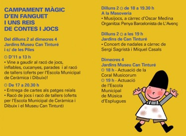 Durant les festes de Nadal, Esplugues ofereix una sèrie d’activitats per als infants. Jocs, música i contes seran els plats principals per a nens i nenes durant els primers dies de l’any, tant al Campament d’en Fanguet com al Parc de Jocs de Reis de Can Vidalet