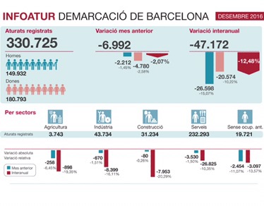 La variació al llarg del 2016 reflexa els descens més important dels darrers anys (12,5%), sent la demarcació on més cau l’atur en nombres absoluts el 2016, i percentualment també la primera d’entre les que tenen més de mig milió d’habitants.