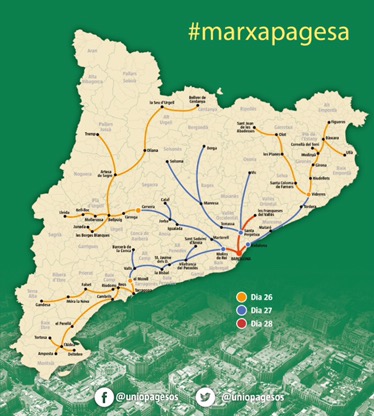 Amb el lema “Lluita amb Unió de Pagesos per la dignitat de la pagesia”, el sindicat ha convocat la pagesia de tot Catalunya i la societat civil en general a participar a la Marxa Pagesa que des del passat 26 de gener transcorre per diversos punts del territori, fins a arribar, demà dia 28, a Barcelona.