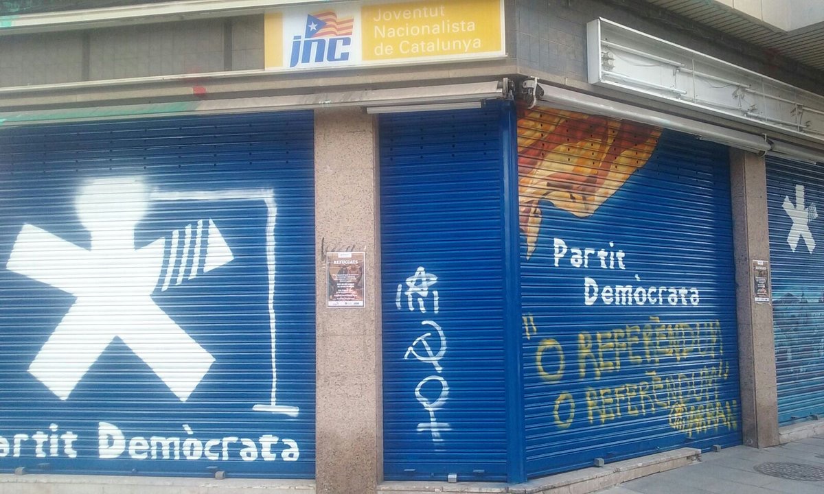 “Democràcia és respecte a qui no pensa com tu”, ha afegit. Al grafiti fet a la persiana de la seu del PDeCAT a Cornellà s’hi pot llegir: “o referèndum o referèndum”.