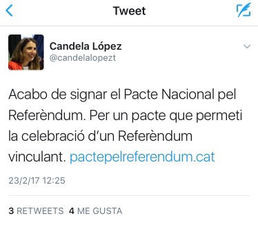 L’alcaldessa de Barcelona, Ada Colau, també va anunciar a través de les xarxes socials que ja havia signat el manifest que impulsa el Pacte Nacional pel Referèndum. “Perquè volem un referèndum efectiu i amb garanties”, va argumentar l’alcaldessa en una piulada des del seu compte personal de Twitter.