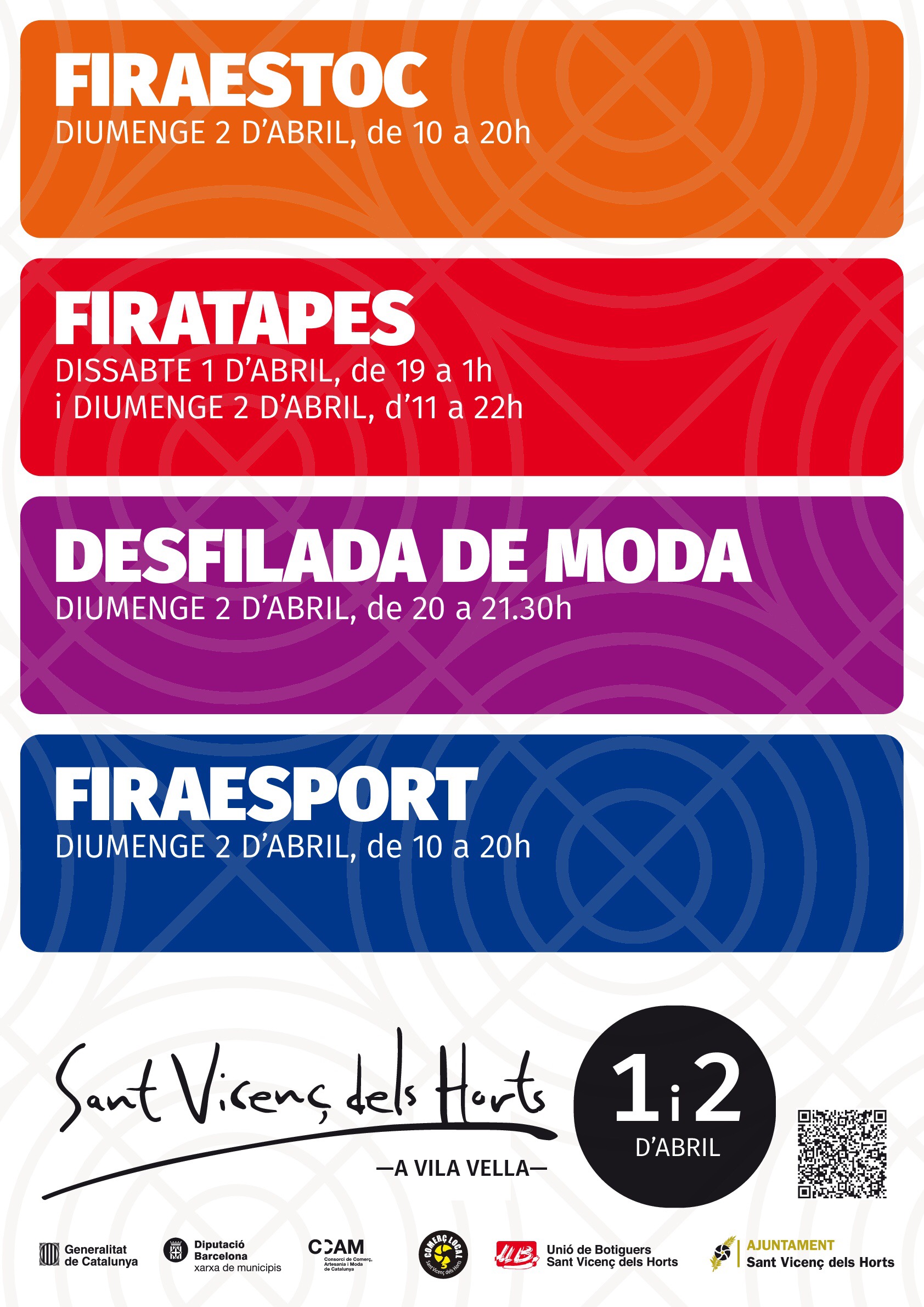 Enguany, se celebra la 17a edició de la fira d’oportunitats comercials Firaestoc, la 15a edició de la fira gastronòmica Firatapes i la 5a edició de la fira d’entitats i activitats esportives Firaesport. Com ja és habitual, les fires vindran acompanyades de la tradicional Desfilada de Moda, organitzada conjuntament amb la Unió de Botiguers de Sant Vicenç dels Horts.