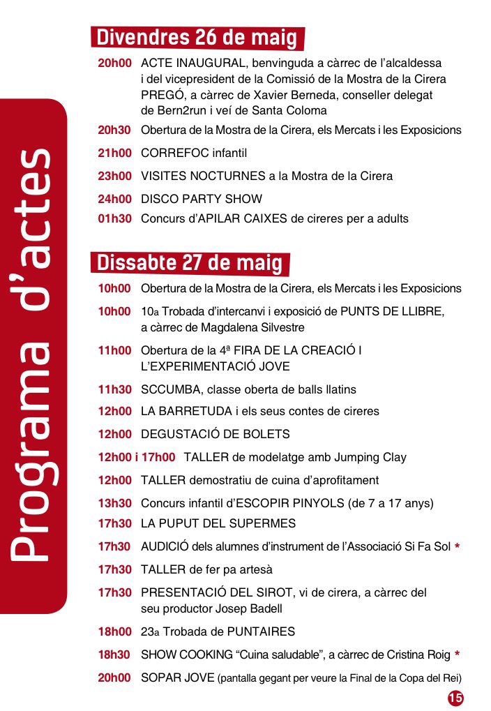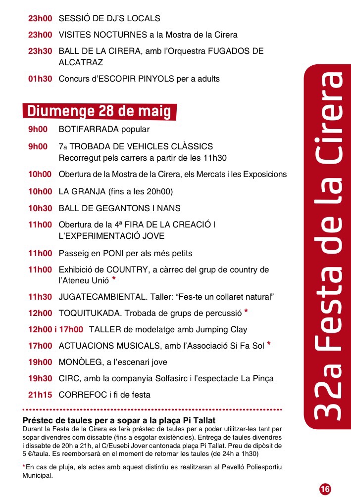 Aquest cap de setmana de maig, trobareu diversió per a tota la família. I evidentment podreu degustar i comprar cireres, i és que diuen que …no hi ha cirera millor que la de Santa Coloma de Cervelló.