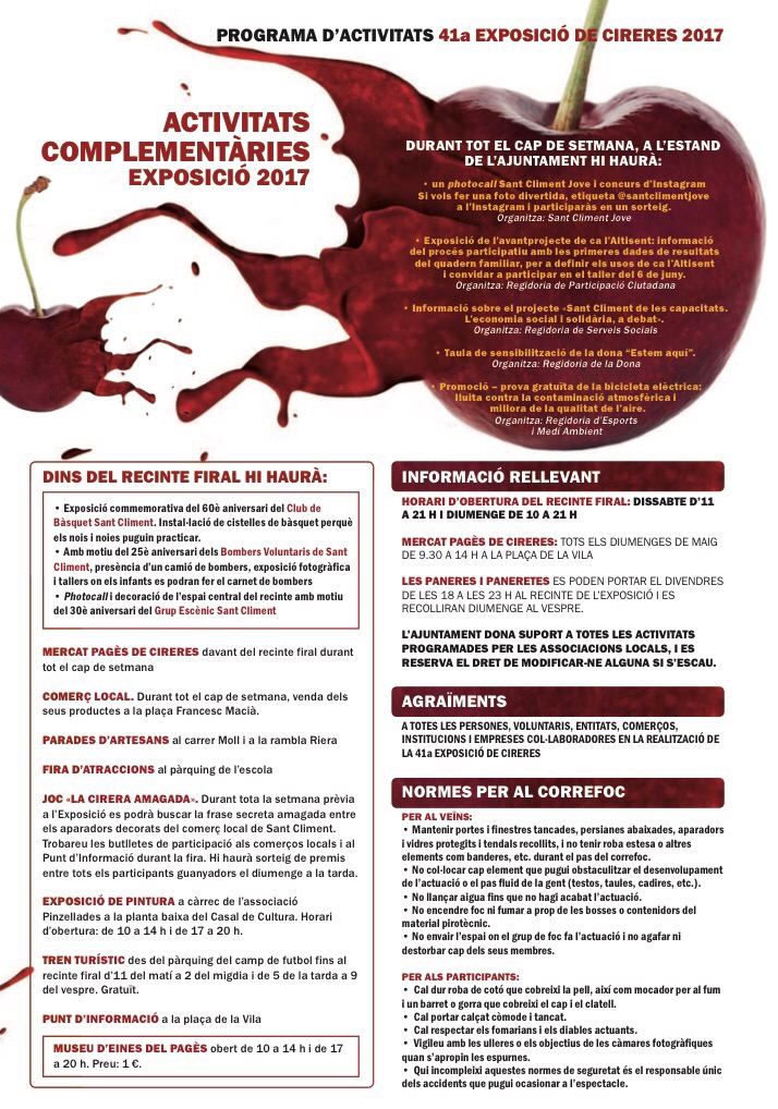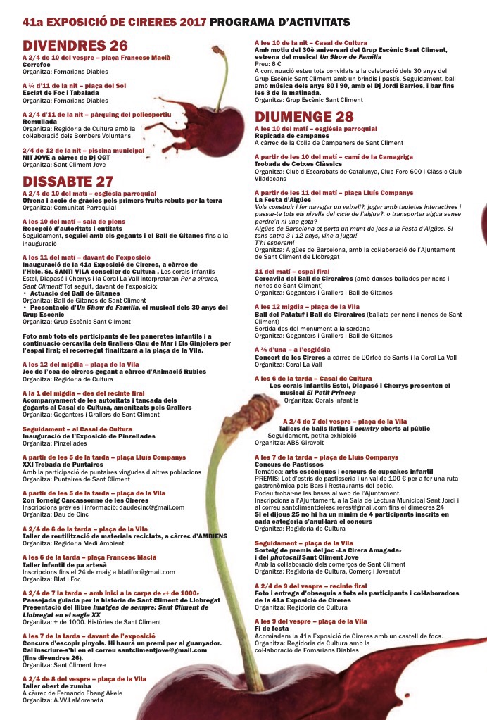 Un cap de setmana dedicat a aquest deliciós fruit vermell, que amb activitats com la 41a Exposició de Cireres, s’està consolidant com un dels productes estrella de la comarca. Enguany, l’Exposició de cireres climentona ha estat dedicada a les arts escèniques
