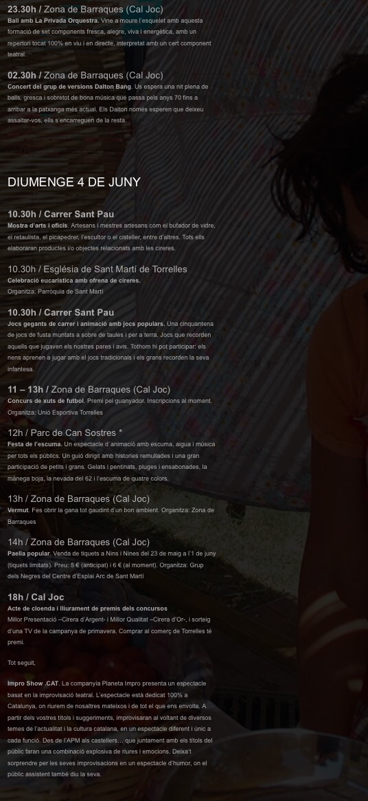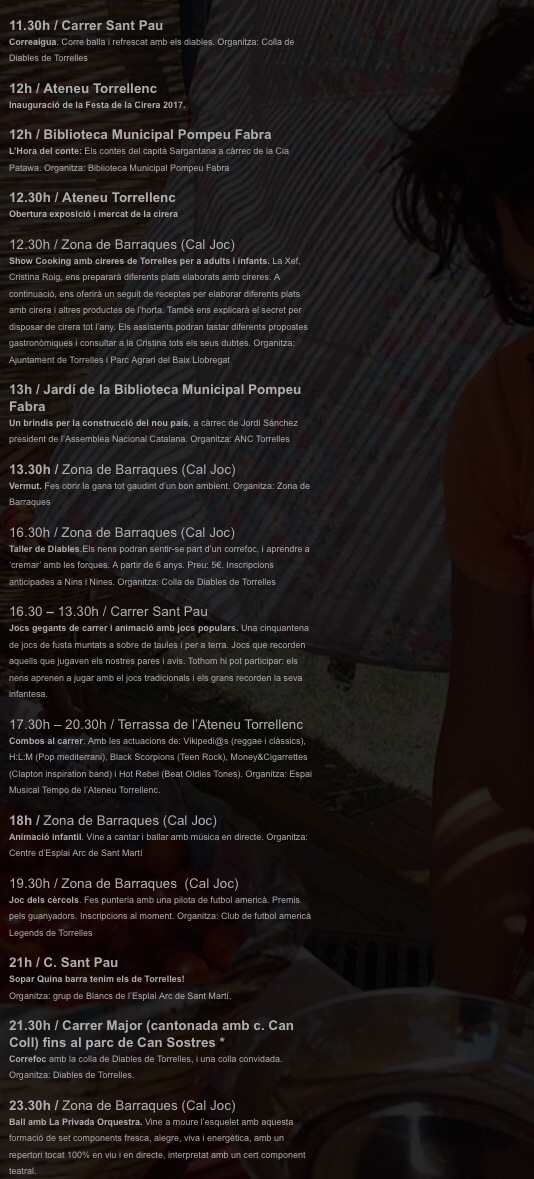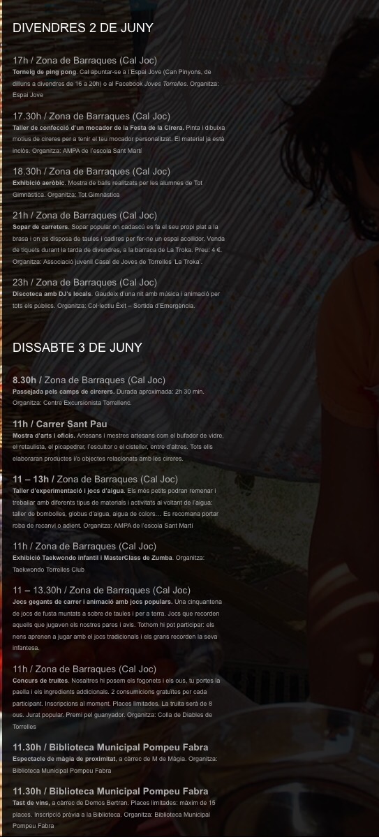 La 37a edició inclou el Mercat per comprar cireres de proximitat, l’Exposició a càrrec de l’Esplai Arc de Sant Martí, la Fira d’artesania i productes locals, la Zona de Barraques i la Mostra d’Oficis.
