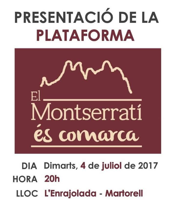 Aquest dimarts es farà la presentació a les 20h a l’Enrajolada de Martorell. Segons la informació oficial, l’acte comptarà amb la presència de Xavier Fonollosa, alcalde de Martorell, Miquel Solà, alcalde de Collbató, Joan Carles Almirall, alcalde de Castellví de Rosanes, Carme Rallo, alcaldessa de Sant Esteve Sesrovires, i regidores i regidors dels municipis d’Abrera, El Bruc, Esparreguera i Olesa de Montserrat.