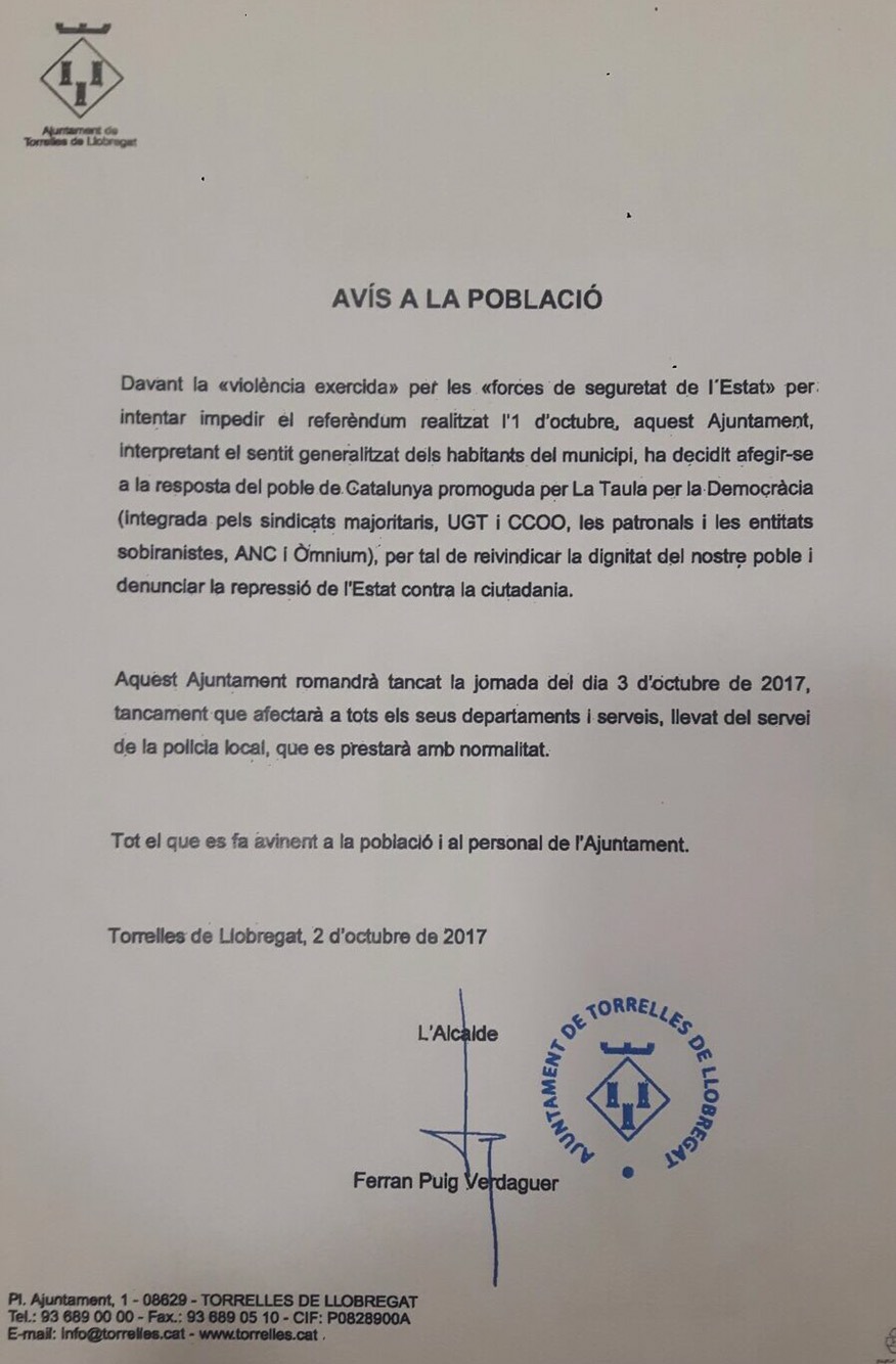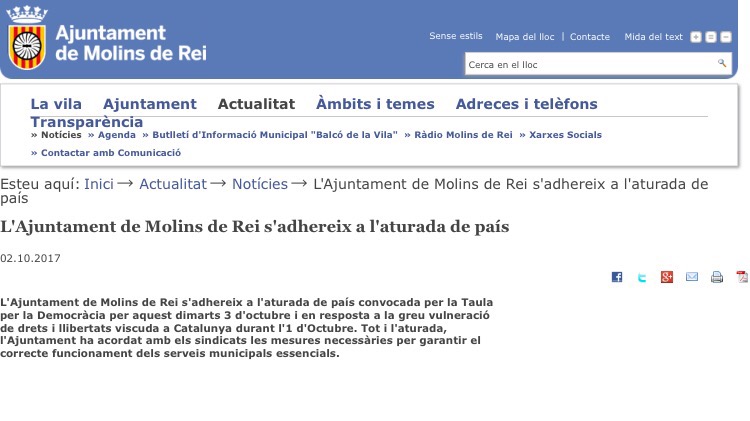 Fórmules diverses però un mateix significat: ahir hi va haver un punt d’inflexió. Els ajuntaments de la comarca estan responent a la crida de la Taula per la Democràcia -de la que formen part sindicats i entitats- que demana que, com a repulsa davant “la intervenció desproporcionada dels cossos de seguretat de l’Estat” les institucions locals se sumin a l'”Aturada de País” de demà