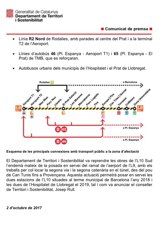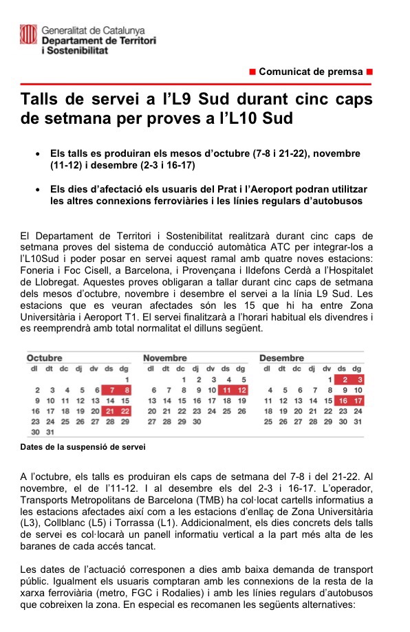 La línia L9 del metro, que dona servei a la nostra ciutat, patirà talls de servei durant cinc caps de setmana, concretament els dies 7, 8, 21 i 22 d’octubre, 11 i 12 de novembre i 2, 3, 16 i 17 de desembre. El motiu dels talls són les obres a la línia L10.