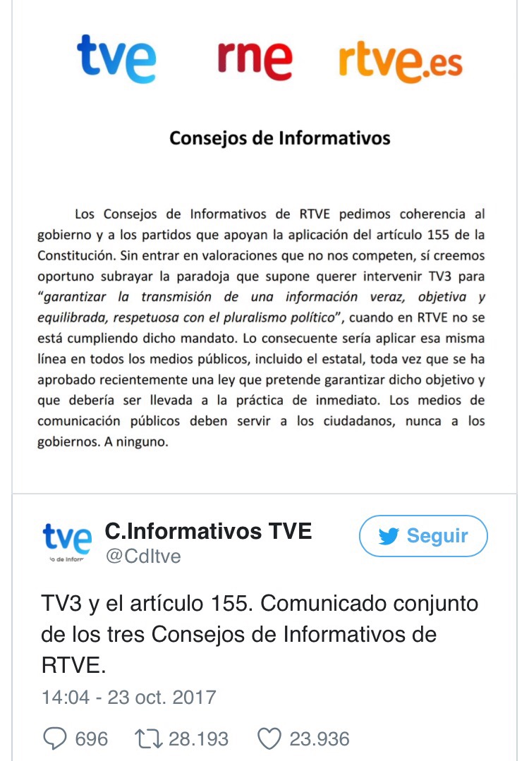 Ahir, els comitès d’empresa de TV3 i Catalunya Ràdio van fer públic un comunicat en què deien que el fet que es qüestionés la seva professionalitat era ‘un insult’, reivindicaven la independència dels mitjans públics catalans i rebutjaven qualsevol control per part del govern central.
