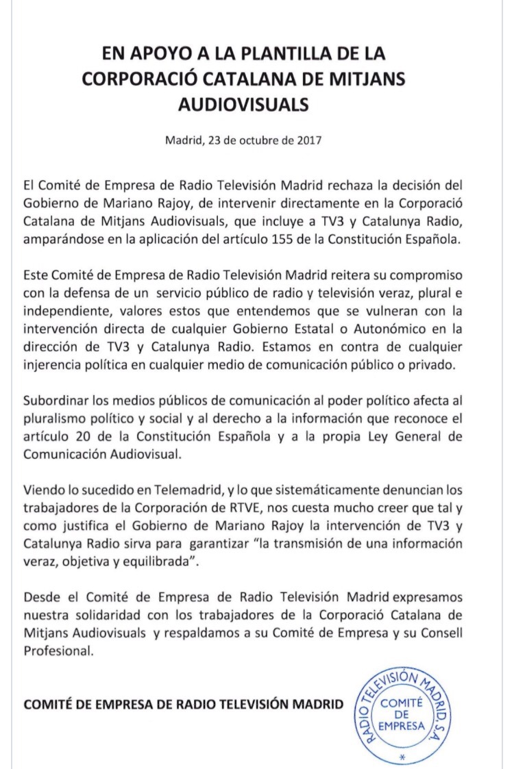1) Rebutja frontalment i denuncia la voluntat del govern espanyol d’intervenir el Govern de la Generalitat, destituir l’Executiu català, ocupar les conselleries i amenaçar el dret a la informació de la ciutadania amb la irrupció en els mitjans de comunicació públics de la CCMA (Corporació Catalana de Mitjans Audiovisuals), TVC, Catalunya Ràdio i l’Agència Catalana de Notícies (ACN).