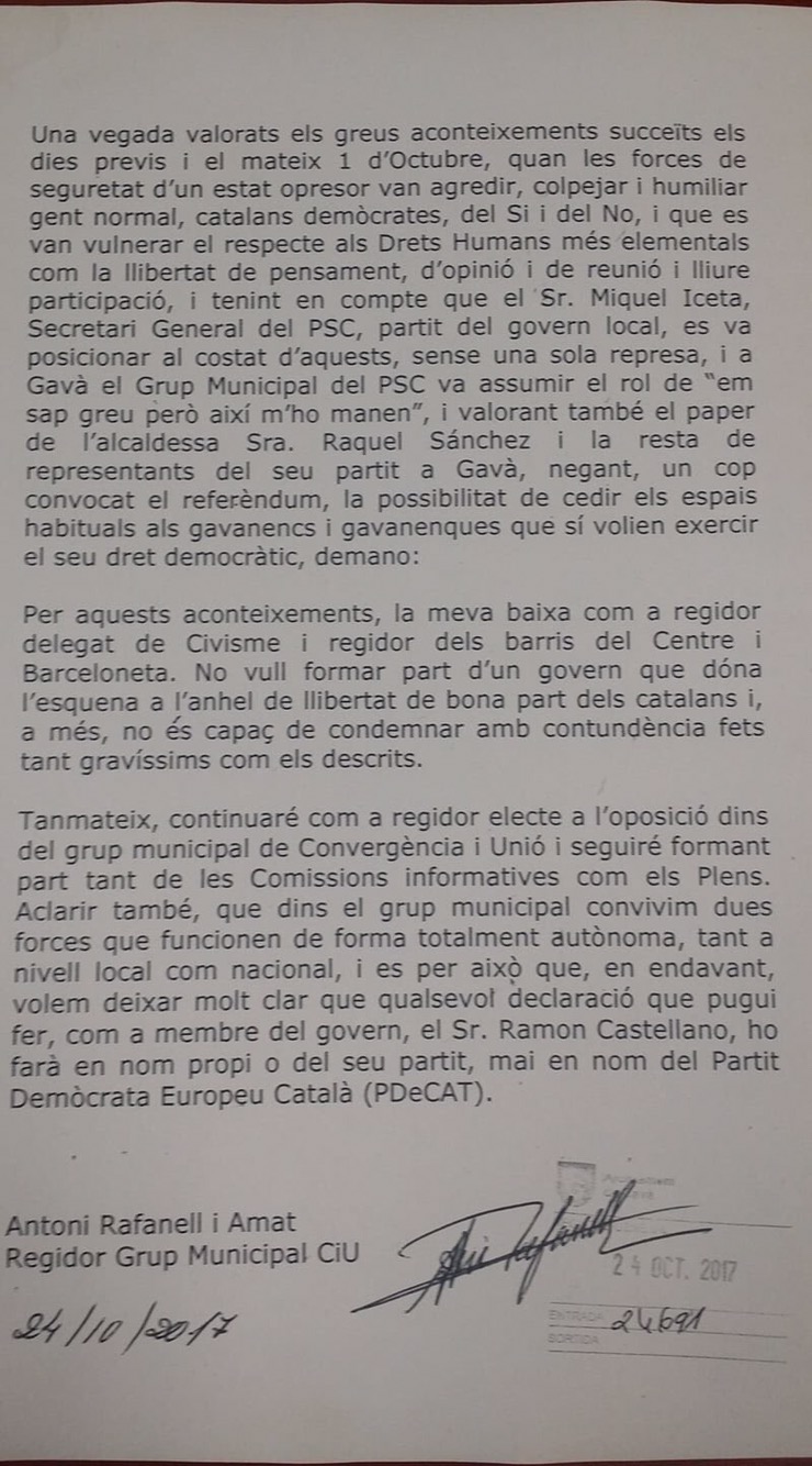 El primer cas en explotar ha estat el de Gavà, ahir mateix, al ple municipal. El regidor del CiU, encarregat de l’àrea de Civisme, Antoni Rafanell, va decidir sortir del pacte de govern establert amb el PSC municipal. Els motius de la renúncia recalquen que el partit socialista “no es va manifestar en contra de la violència policial exercida el dia 1 d’octubre” i que no es van cedir locals per a la celebració del referèndum.