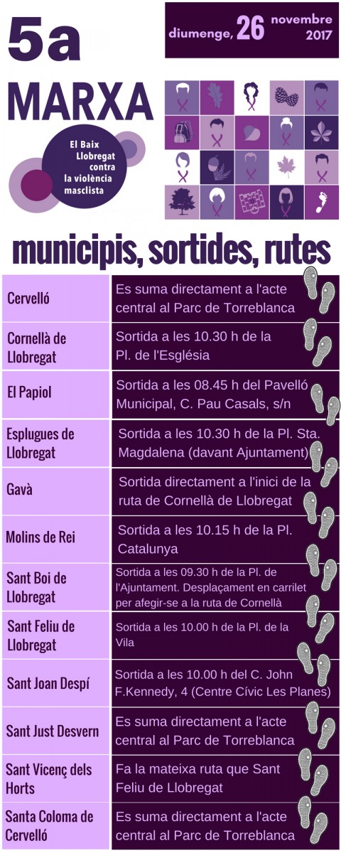 El Baix Llobregat vol mostrar la seva repulsa a la violència masclista de manera unitària, trascendint als actes que es realitzen a cada localitat, i és per això que des de fa 5 anys és celebra la Marxa “El Baix Llobregat contra la Violència Masclista”.