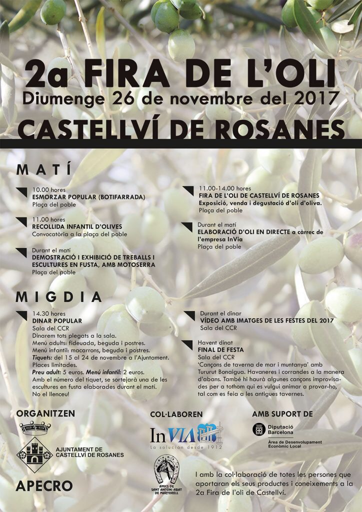 La segona Fira de l’Oli de Castellví de Rosanes se celebra avui diumenge, 26 de novembre, al llarg del matí. El centre neuràlgic de l’activitat serà la plaça del poble, on des de les 10 del matí i fins les 14h es desenvoluparà el gruix de l’activitat. A les 14.30h tindrà lloc un dinar a la sala del CCR i, finalment, una actuació de cançons de taverna clourà la segona edició de la fira.