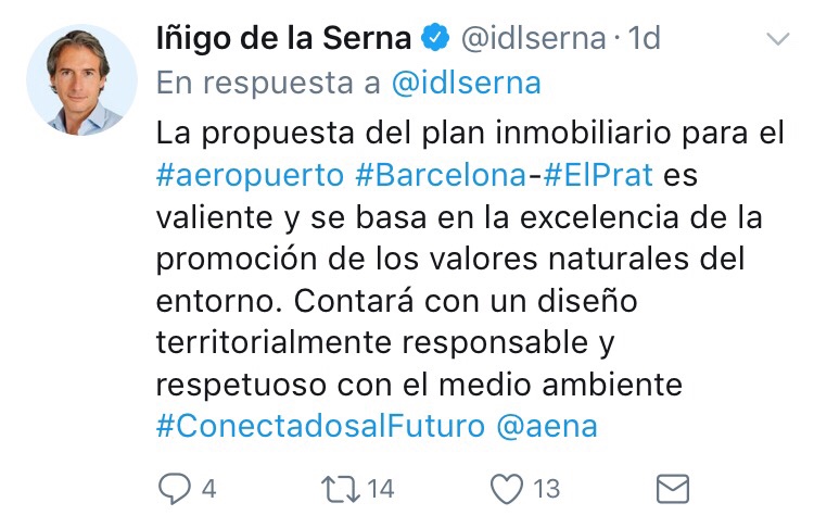 El ministre de Foment, Íñigo de la Serna, va presentar aquest dimecres un macropla immobiliari per transformar el domini de l’aeroport de Barcelona-El Prat en una zona dedicada a la logística, als serveis d’aeronàutica i a oficines per a empreses de l’economia digital