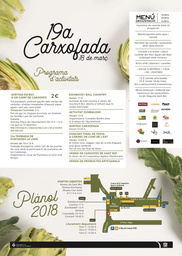 L’associació Degusta Sant Boi i l’Ajuntament organitzen la Carxofada amb la col·laboració de la Cooperativa Agrària Santboiana i el Parc Agrari del Baix Llobregat. El xef santboià Albert Mendiola, cuiner de l’any 2017, col·labora en aquest esdeveniment.