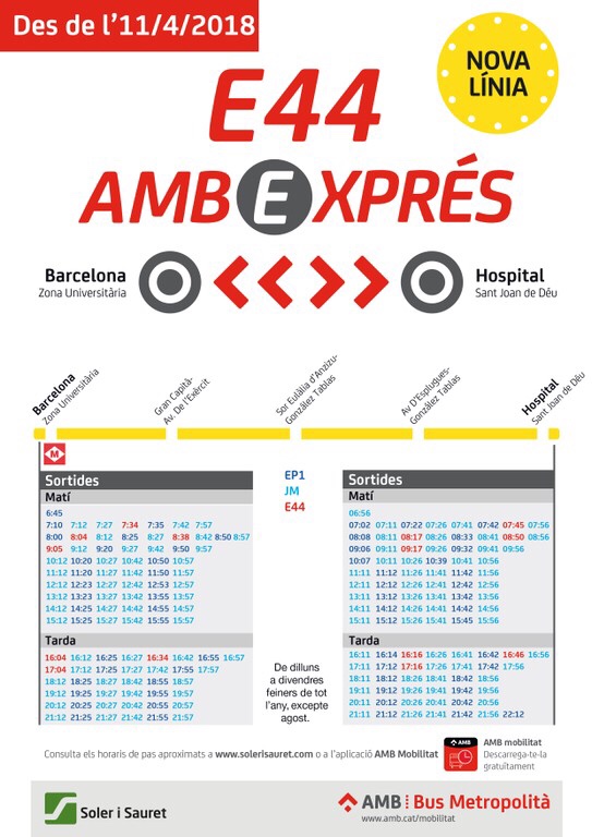 Dimarts, 10 d’abril, l’AMB va inaugurar la línia AMB Exprés E44, entre Sant Joan de Déu i Zona Universitària, una llançadora que connecta l’hospital de referència i que forma part de la nova xarxa d’autobús metropolità d’altes prestacions