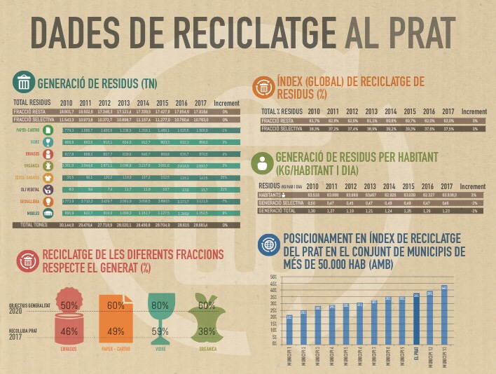 L’any 2017, el Prat va ser el tercer municipi de l’àrea metropolitana més gran de 50.000 habitants, sense comptar Barcelona, que va reciclar més percentatge de residus