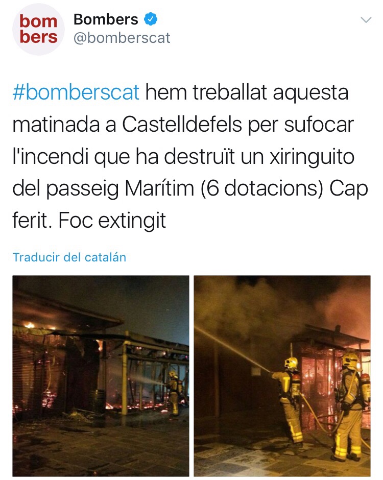 Un incendi ha calcinat aquesta matinada un restaurant de platja situat al Passeig Marítim de Castelldefels, a l’alçada del número 132, sense causar ferits, segons han informat els Bombers de la Generalitat