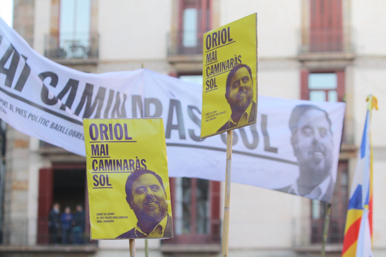 L’acte per commemorar els sis mesos d’empresonament a Estremera del president baixllobregatí d’ERC i vicepresident destituït, Oriol Junqueras, i el conseller destituït d’Interior, Joaquim Forn, ha omplert la plaça Sant Jaume de Barcelona amb proclames de suport als presos independentistes i les seves famílies, i crits en favor de la Republica.