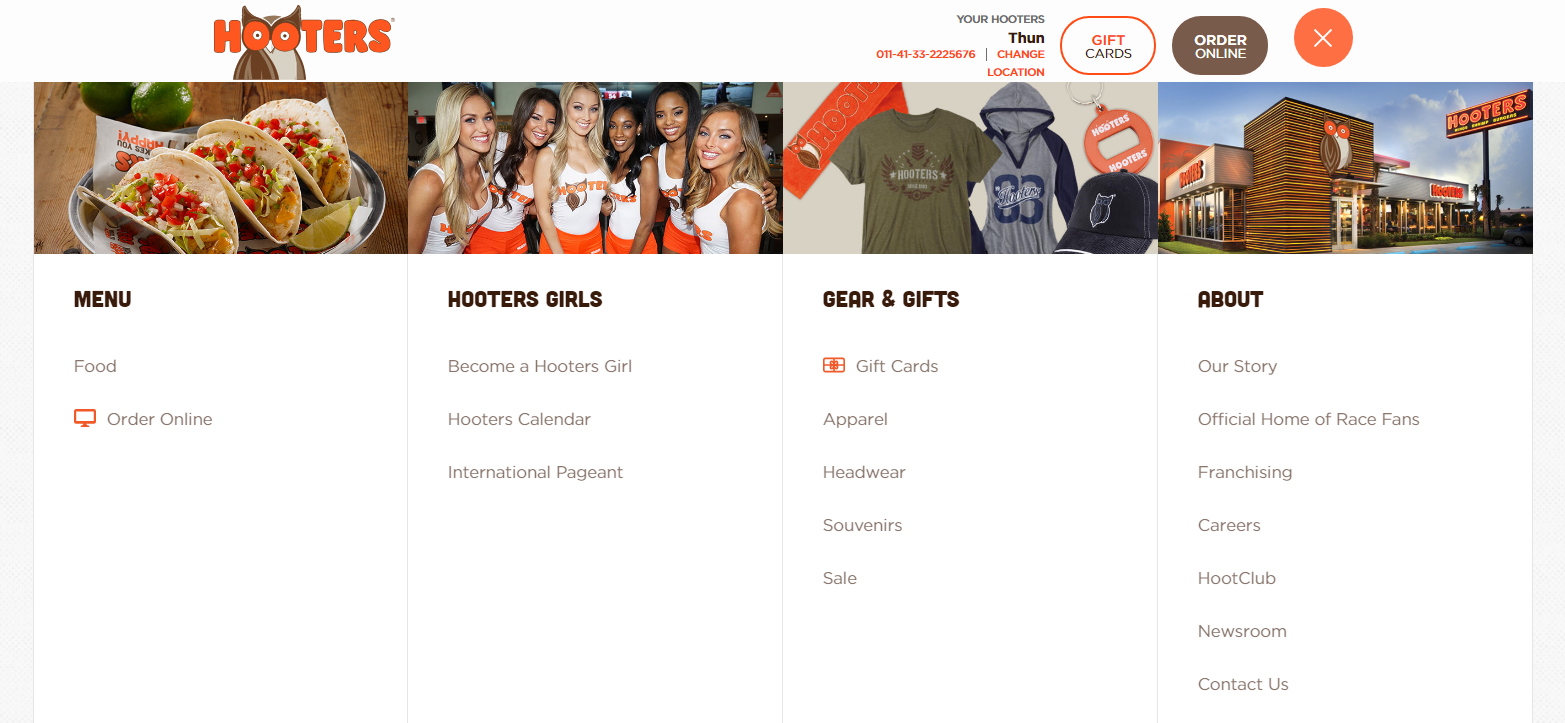 De fet, si es visita la pàgina principal de l’empresa Hooters, es confirma el paper central que juga la dona en la promoció del restaurant. Al menú d’inici de la pàgina web hi ha tres apartats a ofertar: la carta de menjar, les ‘noies’ Hooters i els regals i marxandatge.