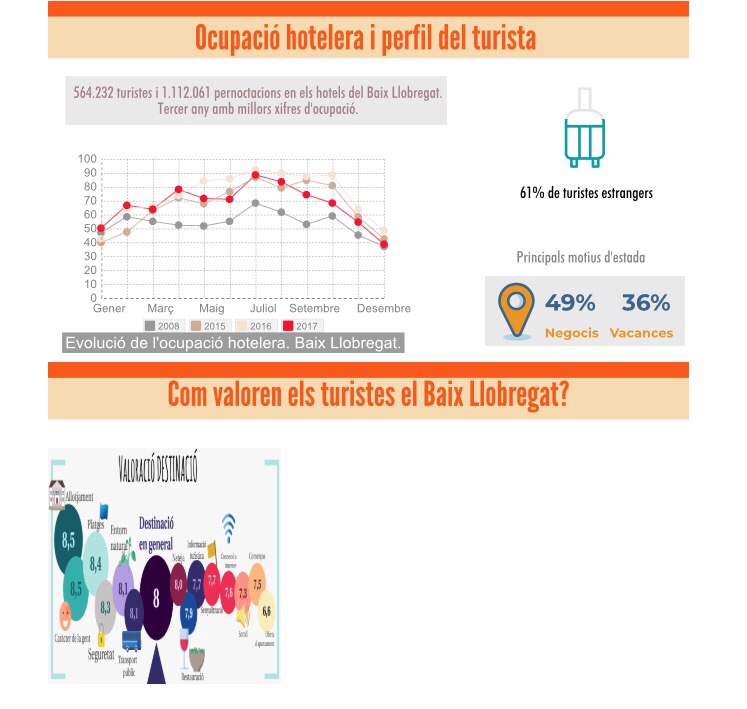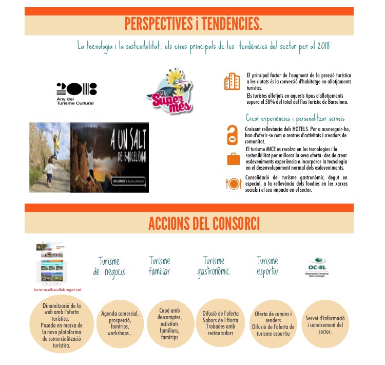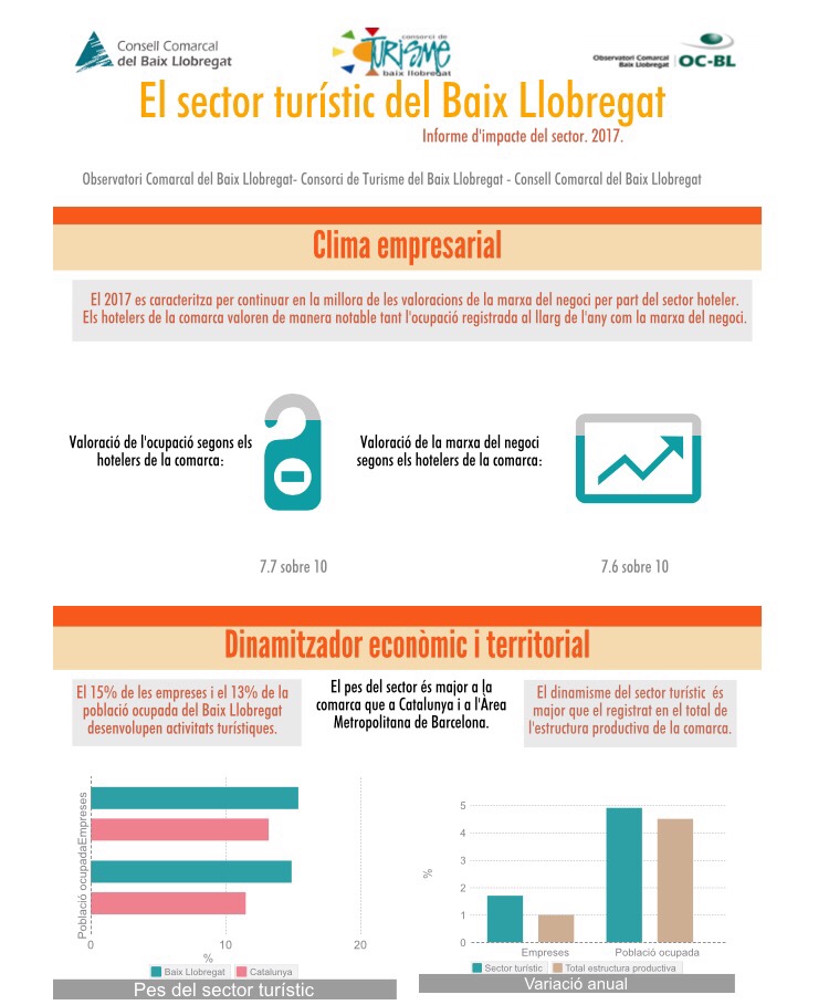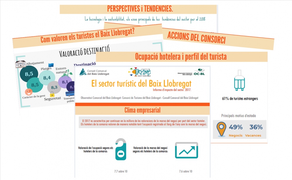 Des de l’OC-BL es publica l’Informe anual del sector turístic del Baix Llobregat 2017. Aquest Informe combina dades generals del sector (clima empresarial, tendències futures o ingressos per turisme internacional) amb les dades concretes de la comarca ( dades de mercat de treball: ocupació, afiliació, contractació i atur registrats; dades d’ocupació hotelera: perfil del turista, mitjana d’ocupació o de tarifes).