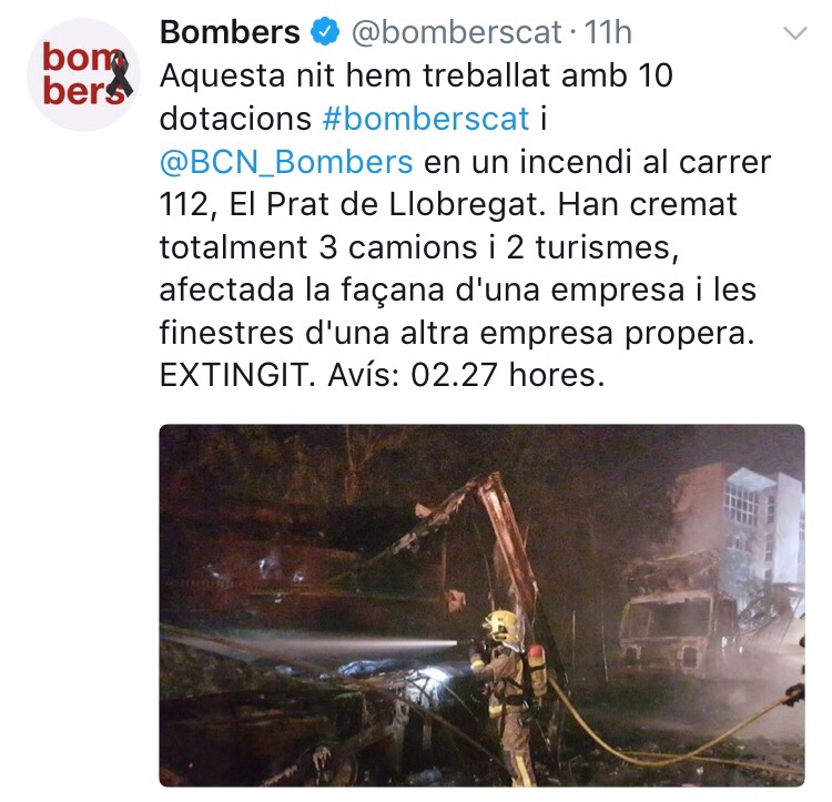 Aquest ha estat el tuit dels Bombers informant des del seu compte de Twitter oficial: