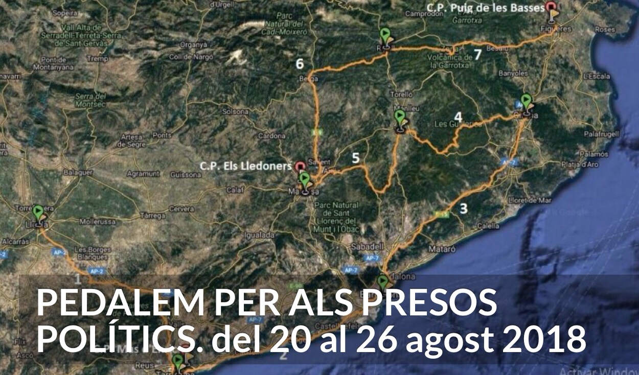 Una pedalada reivindicativa sota el nom de ‘Pedalem per als presos polítics’ recorrerà Catalunya durant una setmana per reclamar l’alliberament dels polítics i líders independentistes presos. Sortirà dilluns al matí des de Lleida i es dividirà en set etapes en què els participants discorreran per diferents poblacions del país. Així mateix, faran parada als centres penitenciaris on es troben tancats, en concret a Mas d’Enric, a Lledoners i a Puig de les Basses, on finalitzarà la pedalada el diumenge dia 26.