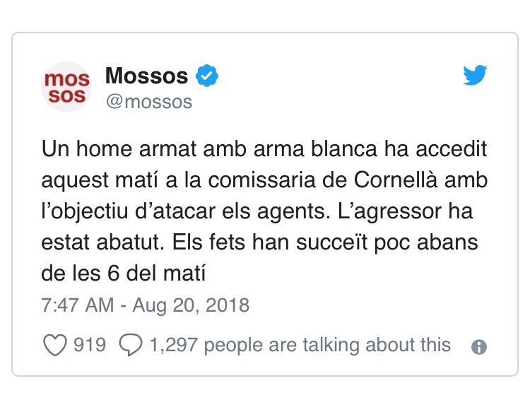 Segons ha avançat aquest dilluns a primera hora ‘La Vanguardia’ i ha confirmat l’ACN, en el moment d’entrar a la comissaria l’home, que era de nacionalitat algeriana, ha cridat ‘Allahu Akbar’ (Alà és gran). Els Mossos d’Esquadra tenen previst aquest migdia donar més detalls dels fets en una roda de premsa.