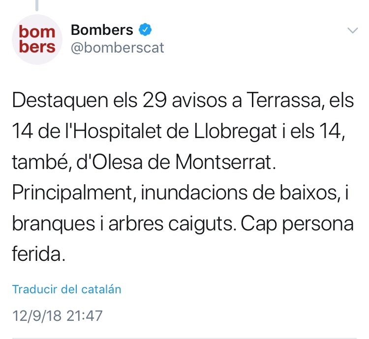 Citant el Servei Meteorològic de Catalunya, el mateix cos va explicar que, pel que fa a quantitat de pluja, es van recollir, per exemple, 22,8 litres per metre quadrat en 30 minuts al Prat de Llobregat.