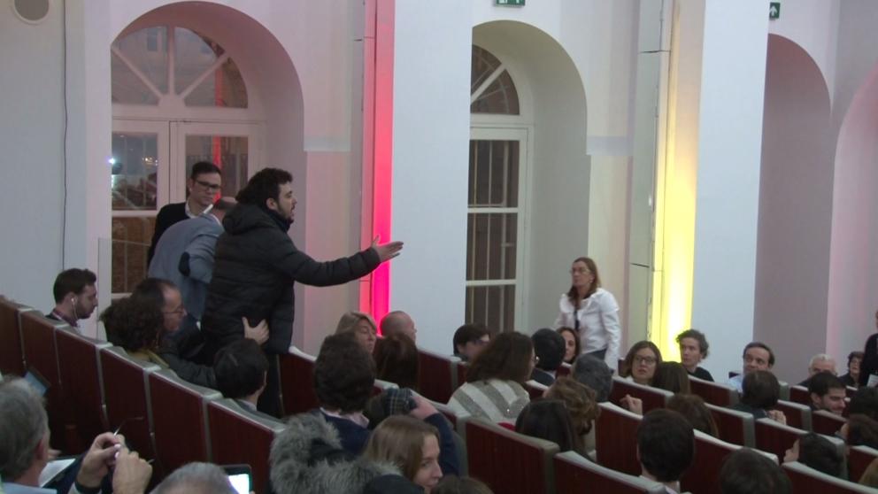 Adrià Carrasco, d’Esplugues de Llobregat desplaçat a Brussel·les a causa de la emissió de l’ordre de detenció per part de l’Audiència Nacional, va irrompre ahir en el discurs que el ministre d’Assumptes Exteriors, Josep Borrell estava pronunciant en un acte de Societat Civil Catalana (SCC) sobre el 40è aniversari de la Constitució espanyola.
