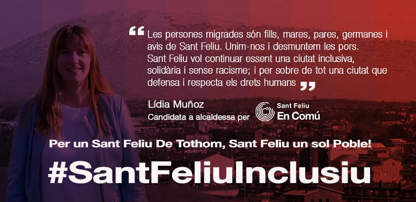 Lídia Muñoz, candidata a alcaldessa per Sant Feliu en Comú, ha declarat que: “Les persones migrades són fills, mares, pares, germanes i avis de Sant Feliu. Unim-nos i desmuntem les pors. Sant Feliu vol continuar essent una ciutat inclusiva, solidària i sense racisme; i per sobre de tot una ciutat que defensa i respecta els drets humans”.