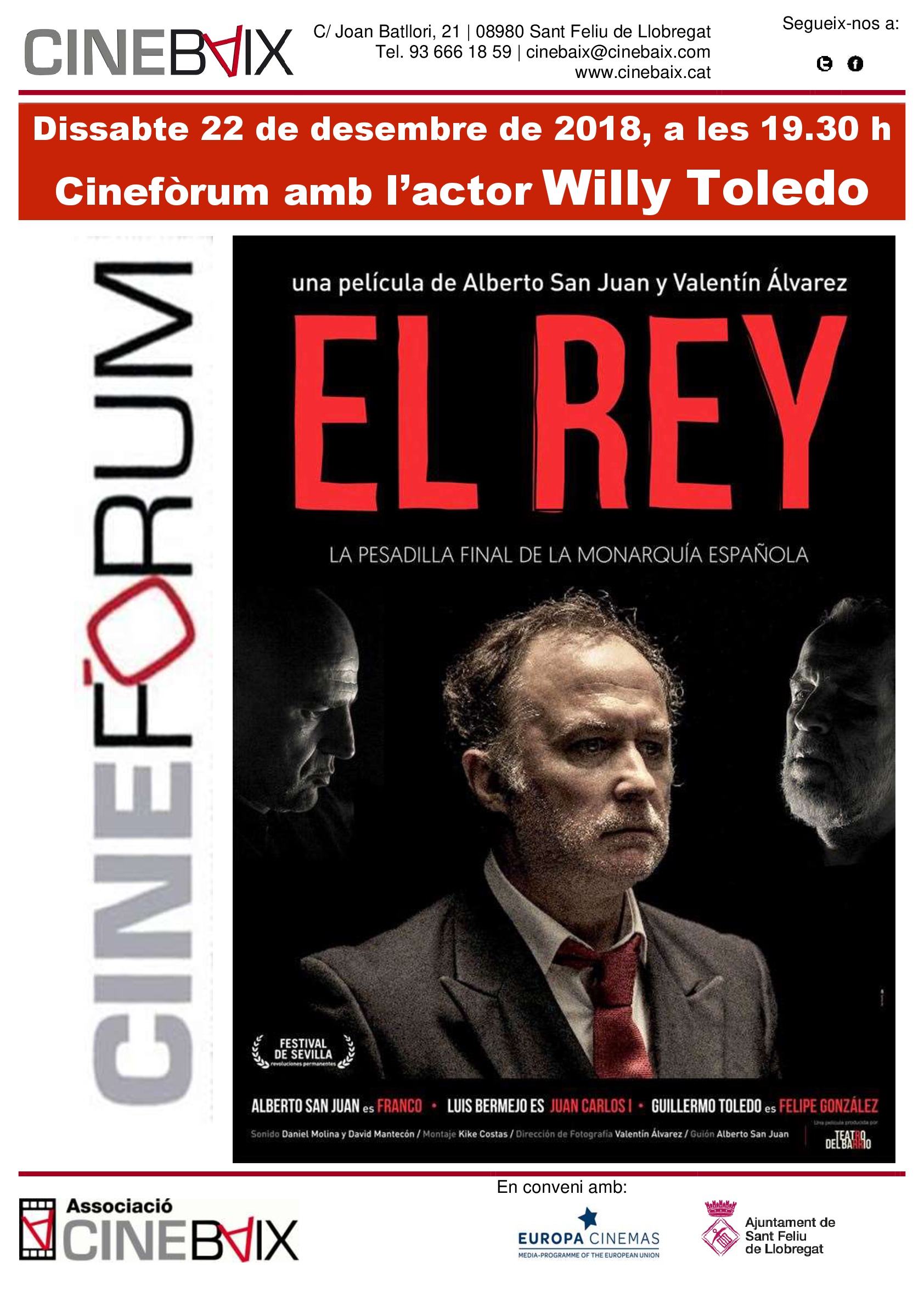 Dissabte 22 a les 19.30 es celebrarà un cinefòrum al Cinebaix de Sant Feliu de Llobregat, sobre el film El Rey, amb la presència de l’actor de la pel·lícula Willy Toledo