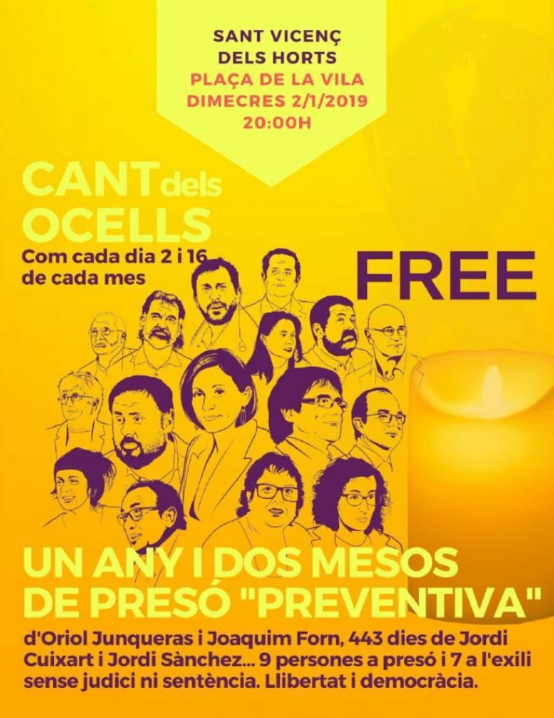 Torna a ser dia 2, i es compleix l’any i els dos mesos de l’empresonament dels presos i preses polítiques. Cada dia 2 i cada dia 16, des de fa catorze mesos, els veïns i veïnes de Sant Vicenç dels Horts es reuneixen a la Plaça de la Vila per a exigir-ne el seu alliberament.