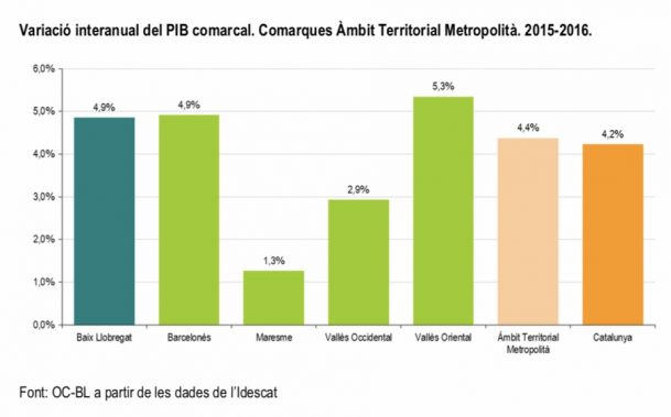 El Baix Llobregat, és la tercera comarca en Producte Interior Brut de Catalunya. Els 24.923 milions d’euros del PIBpm del Baix Llobregat representen l’11,1% del PIB de Catalunya. Respecte l’any 2015, ha crescut en 0,07 punts percentuals el pes del PIB comarcal respecte el conjunt de Catalunya. És la tercera comarca en creixement del PIB de les comarques de l’Àrea Metropolitana en el període 2015-2016