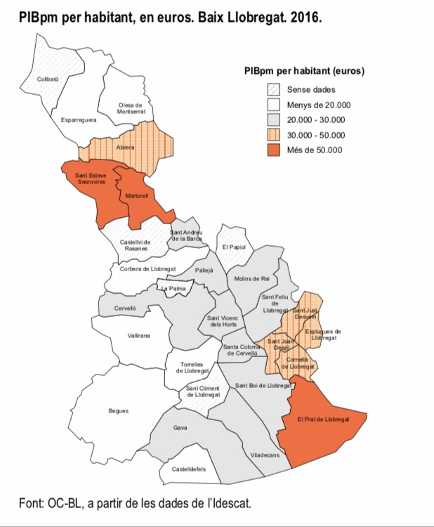 Onze municipis del Baix Llobregat superen el valor estimat del PIB català per centre de treball (279.563 €)  amb un creixement de les unitats de producció del 3,6% i del PIB comarcal per centre de treball del 8.8%