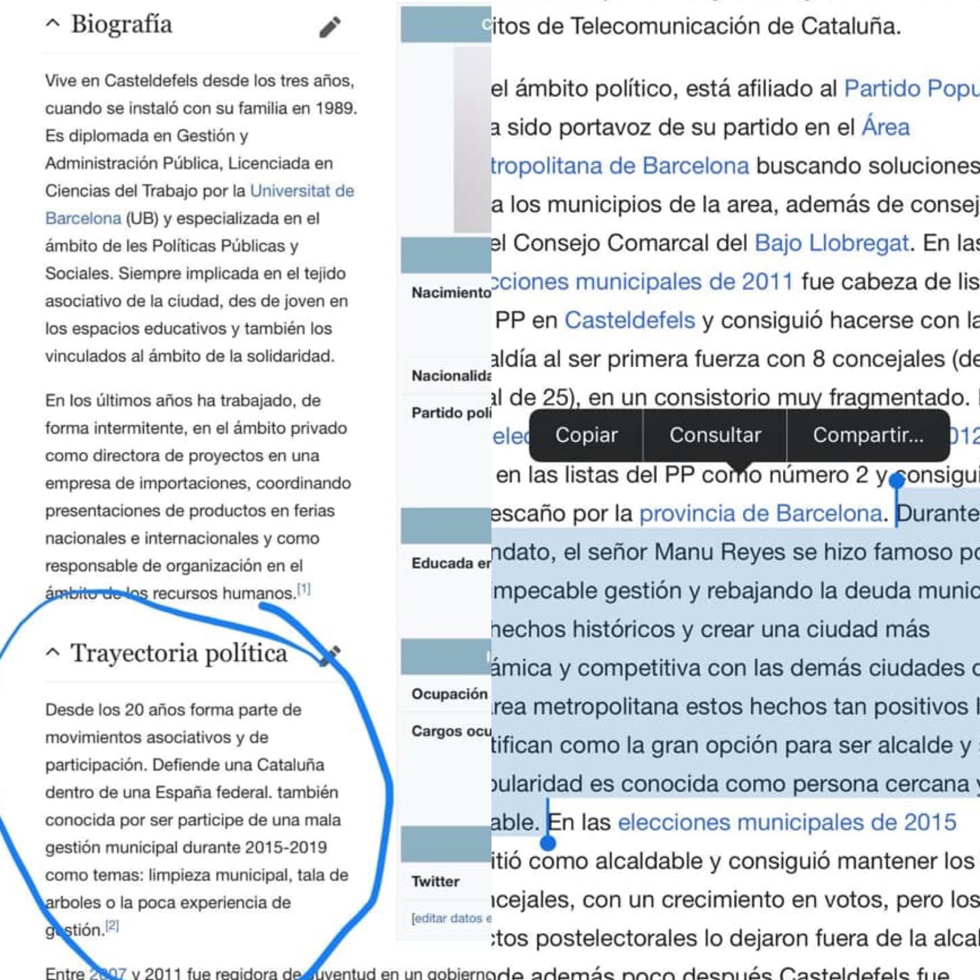 Des d’aquesta setmana, un nou canvi al perfil de Reyes indica que el líder del PP a la Diputació de Barcelona és “famós per la seva impecable gestió” i una persona “propera i amable”, mentre que a la biografia de López s’assegura que és “coneguda per una mala gestió” i per la seva “poca experiència”.