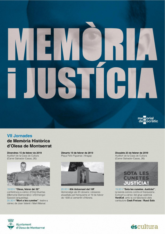 Aquest divendres a les 19.00h tindrà lloc el primer dels actes a l’auditori de la Casa de Cultura, amb la conferència “Olesa, febrer del 39” per Oriol Dueñas, historiador membre del Memorial Democràtic i autor del llibre “La violència d’uns i altres. La repressió de la guerra i la postguerra 1936-1945. El cas d’Olesa de Montserrat” i amb Ermengol Gassiot, arqueòleg, que va dirigir l’any 2004 les excavacions al cementiri vell d’Olesa per buscar una fosa comuna amb persones afusellades per les tropes franquistes.