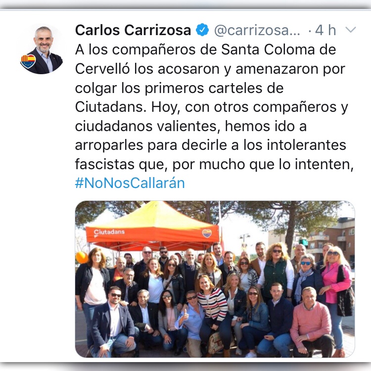 Carrizosa assegura a la seva piulada que el “feixisme independentista” intenta “coaccionar companys valents en campanya”. Al vídeo compartit pel portaveu taronja s’escolten crits llunyans amenaçadors: “Us matarem!”. Per Carrizosa, “Cs és l’única garantia que Pedro Sánchez no pacti amb l’independentisme”.