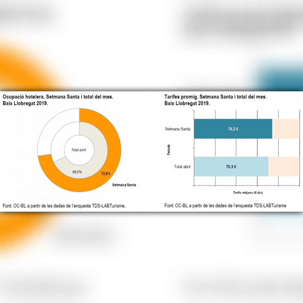 L’ocupació hotelera del Baix Llobregat en el període de Setmana Santa del 2019 va ser del 72,8% esdevenint l’any amb major ocupació de la dècada. Respecte 2016, l’ocupació creix en més de 3 punts percentuals
