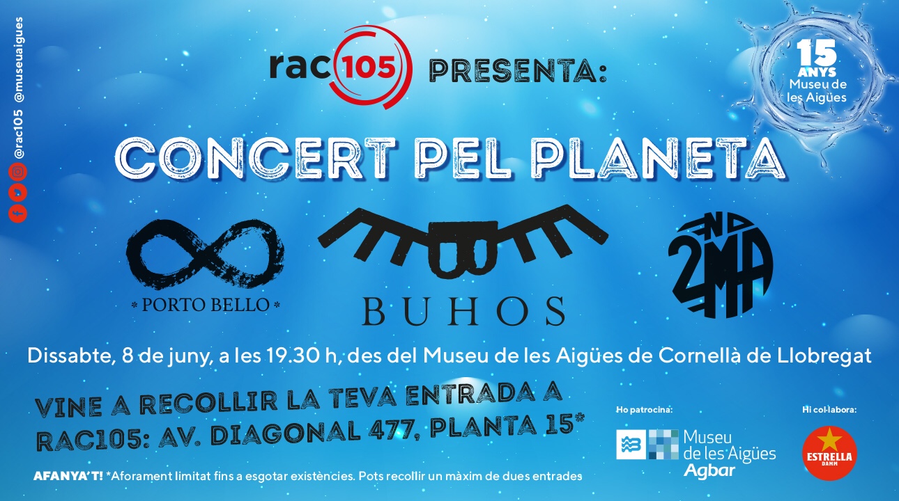 El Museu de les Aigües de Cornellà de Llobregat acollirà el pròxim dissabte el primer ‘Concert pel Planeta’ amb les actuacions de Buhos, Porto Bello i Segona mà.
