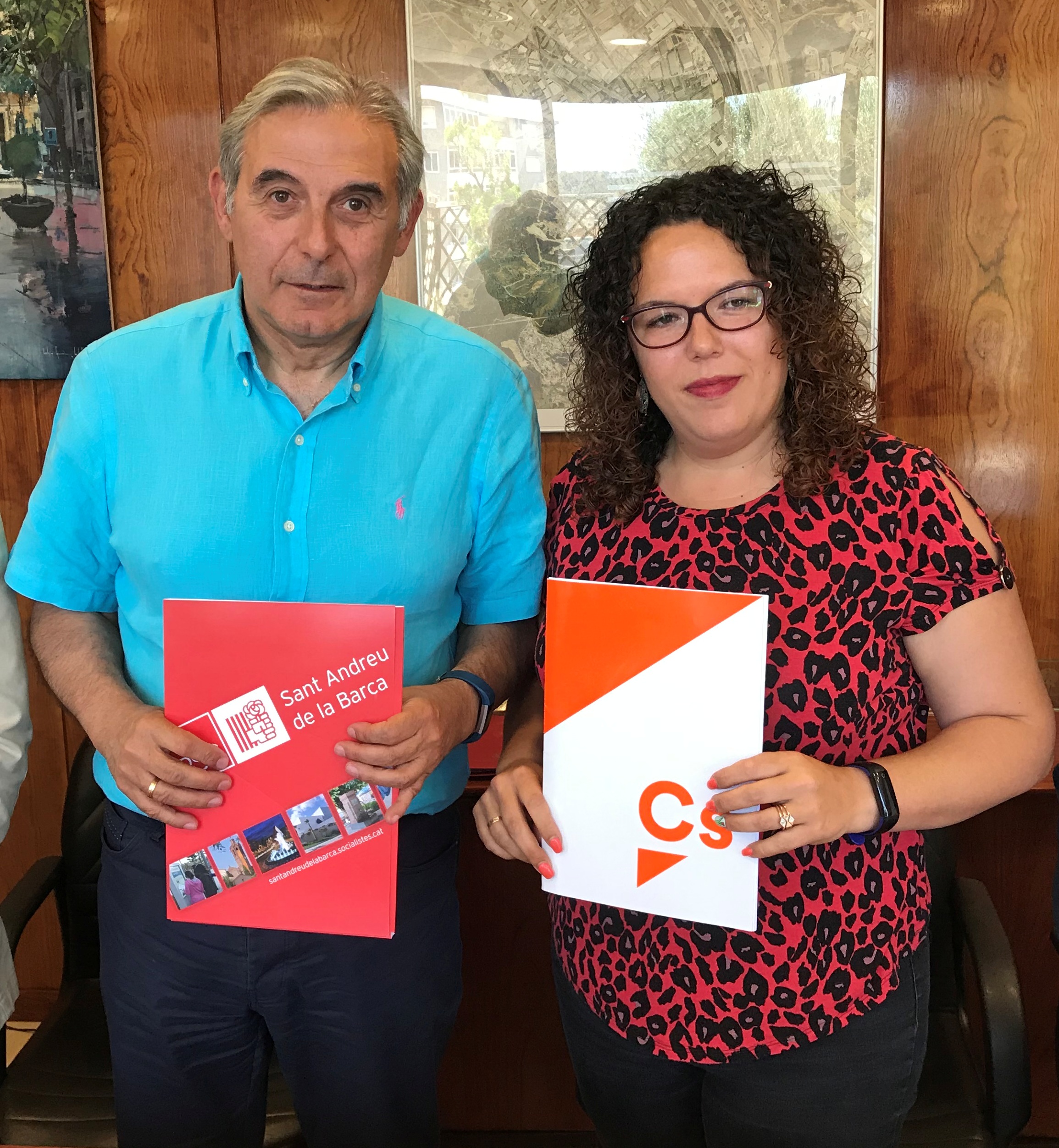 El president del PSC de Sant Andreu de la Barca, Enric Llorca, i la coordinadora de C’s, Saray Cantero, han signat aquest dijous l’acord al que han arribat les dues formacions. La llista encapçalada per Llorca va ser la més votada el passat 26 de maig amb un total del 42,5% dels vots i obtenint 10 dels 21 regidors del ple. Ciutadans va obtenir el 12% dels vots i 3 regidors.