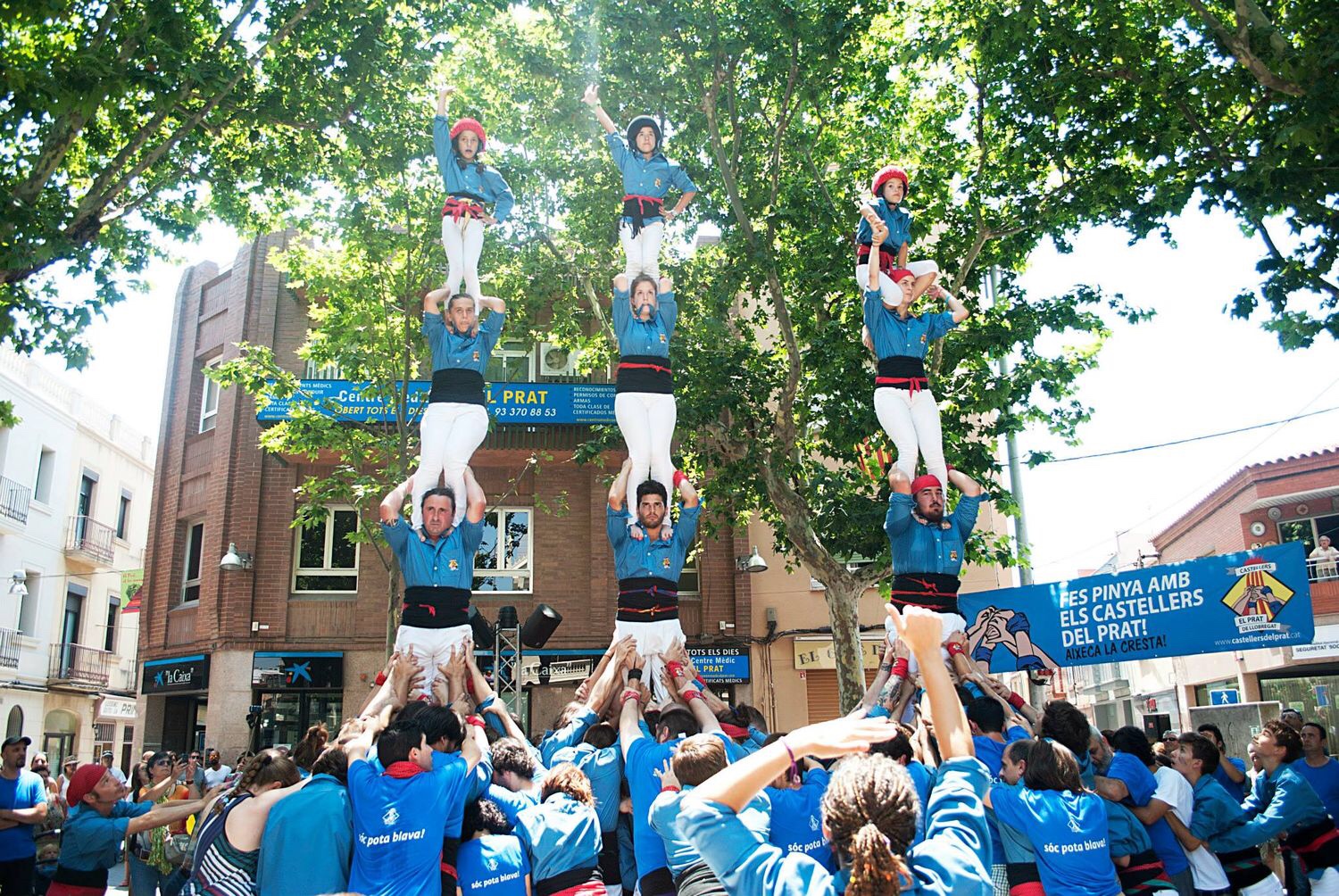 Ara fa cinc anys els i les castelleres del Prat es constituien com a colla i escollien el seu escut, guanyant-se la seva camisa blau potablava un any més tard, en les mateixes dates. Es consolidava d’aquesta manera una iniciativa nascuda a principis del 2014 amb l’objectiu de fundar una colla local en un municipi on el fet casteller està arrelat de fa temps: ja als anys quaranta del segle XX, la plaça de la Vila del Prat va ser l’escenari d’algunes de les primeres actuacions castelleres que van comptar amb la participació femenina. En concret, la d’Aurora Batet, dels desapareguts Xiquets d’Eramprunyà. Aquesta mateixa plaça, que és de nou, acull des de fa dècades la diada castellera de Festa Major a finals de setembre.