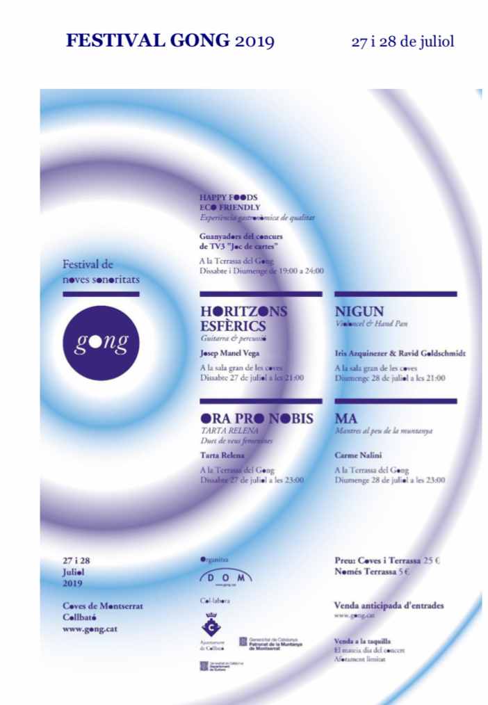 Dissabte 27 i diumenge 28 de juliol, les Coves de Montserrat, a Collbató, acolliran la XIV edició del GONG, el festival dedicat als nous sons i compromès amb les músiques del món.