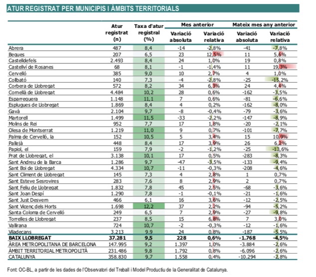 A finals del mes de juliol, l’atur registrat al Baix Llobregat s’ha situat en 37.281 persones, augmentant respecte el mes anterior en 228 persones (+0,6%), i la taxa d’atur registral es situa al 9,5%