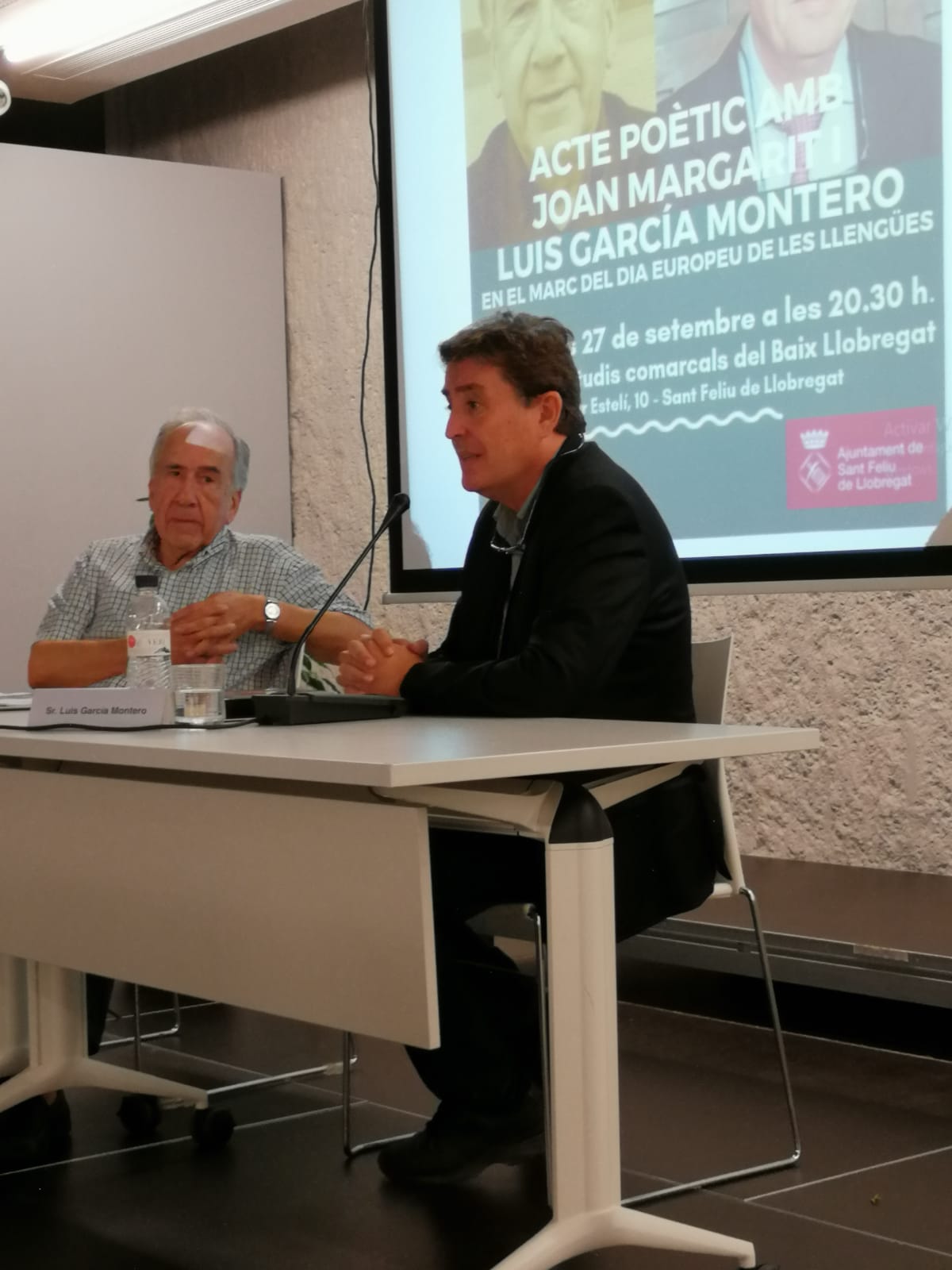 Èxit. Ple de gom a gom. La sala d’actes del Centre Cívic Mas Lluí de Sant Feliu de Llobregat va quedar petita per acollir el recital de poesia de Joan Margarit i Luis Garcia Montero.