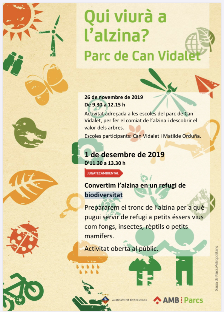 L’acte se celebrarà el proper 1 de desembre dins la programació de Jugatecambiental. D’11.30h a 13.30h es prepararà el tronc de l’alzina per a què pugui servir de refugi a petits éssers vius com fongs, insectes, rèptils o petits mamífers.