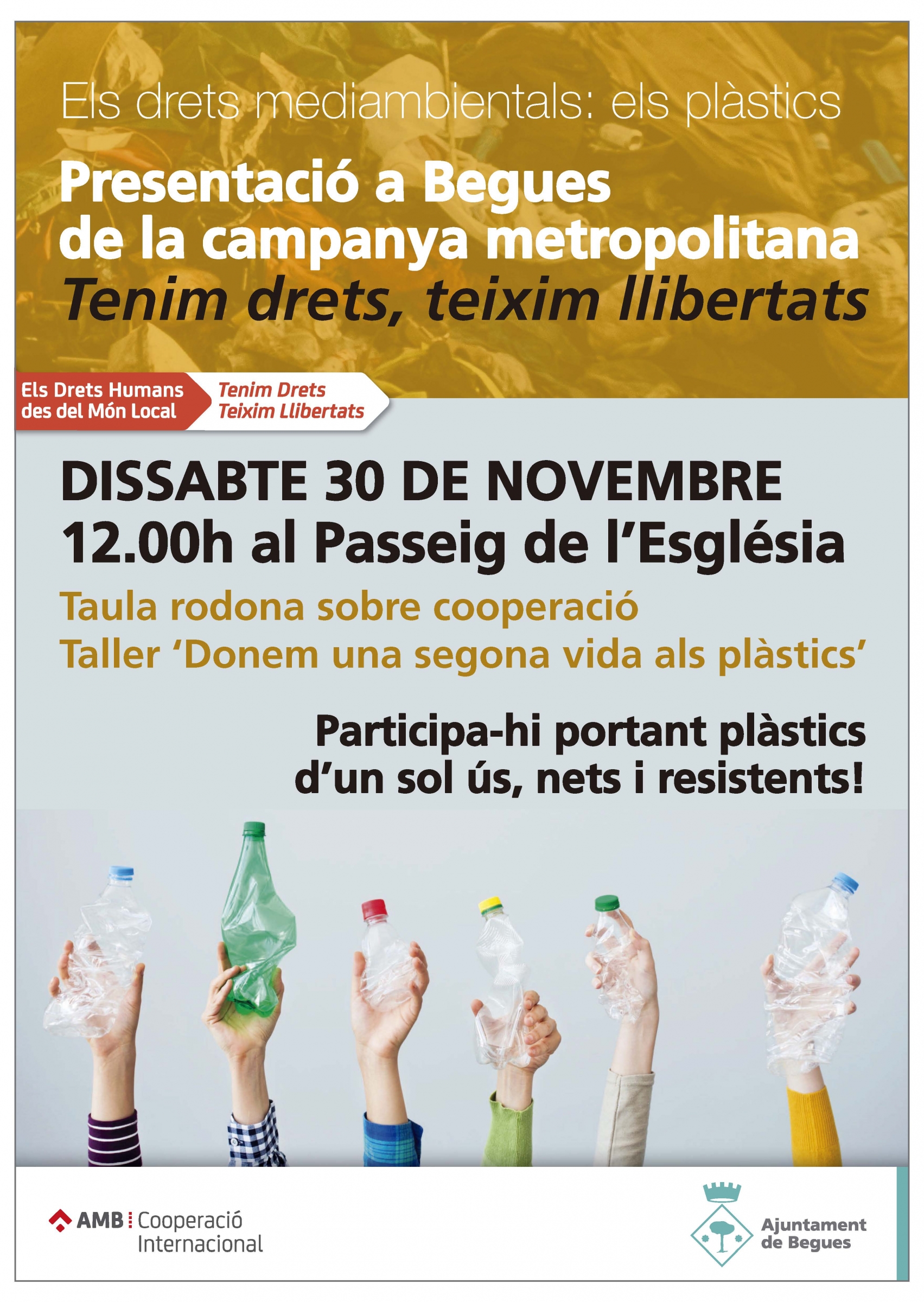 Treballar des del món local per tal de provocar un canvi global davant dels principals reptes que afronta el planeta: Aquest és el principal objectiu darrera del programa de l’Àrea Metropolitana de Barcelona ‘Tenim drets, teixim llibertats’ que enguany inicia la seva quarta edició. En concret, en aquesta ocasió, la proposta al voltant dels Drets Humans se centrarà en els drets ambientals i tindrà el seu punt d’inici a Begues el dissabte 30 de novembre a partir de les 12 h.