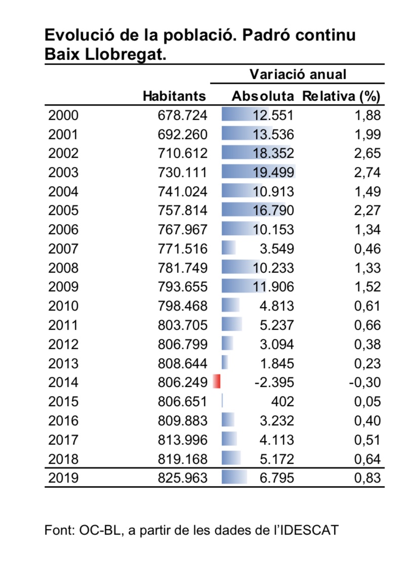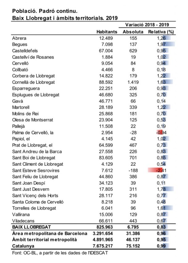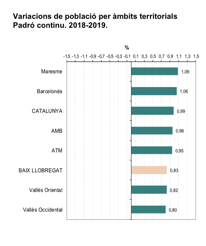 Aquestes dades mostren com la comarca ha experimentat un augment de població del 0,8% en relació amb l’any 2018, que es tradueix en un increment de 6.795 persones, situant-se en un total de 825.963 habitants. Es veu així com la comarca continua amb la tendència de creixement dels anys anteriors.