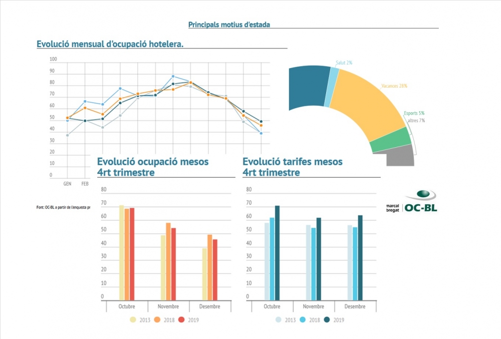 Durant el quart trimestre de 2019 s’ocupen el 56% de les places hoteleres ofertes en els hotels de la comarca. Respecte el quart trimestre de 2018 disminueix l’ocupació (-1pp) i augmenten les tarifes més d’un 15%. El Baix Llobregat es continua situant entre les comarques de Barcelona amb major ocupació. Octubre, és el millor mes d’ocupació d’aquest trimestre.