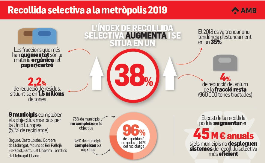 Els resultats de recollida selectiva de residus a l’àrea metropolitana de Barcelona mostren, durant el 2019, una millora en les xifres, després que l’any 2018 es revertís un estancament de gairebé una dècada al voltant del 35 %. En l’últim any, la recollida selectiva s’ha vist afavorida, sobretot, per l’impuls de l’AMB de sistemes que individualitzen la recollida, com ara els contenidors intel·ligents, la recollida porta a porta i els circuits de recollida comercial.